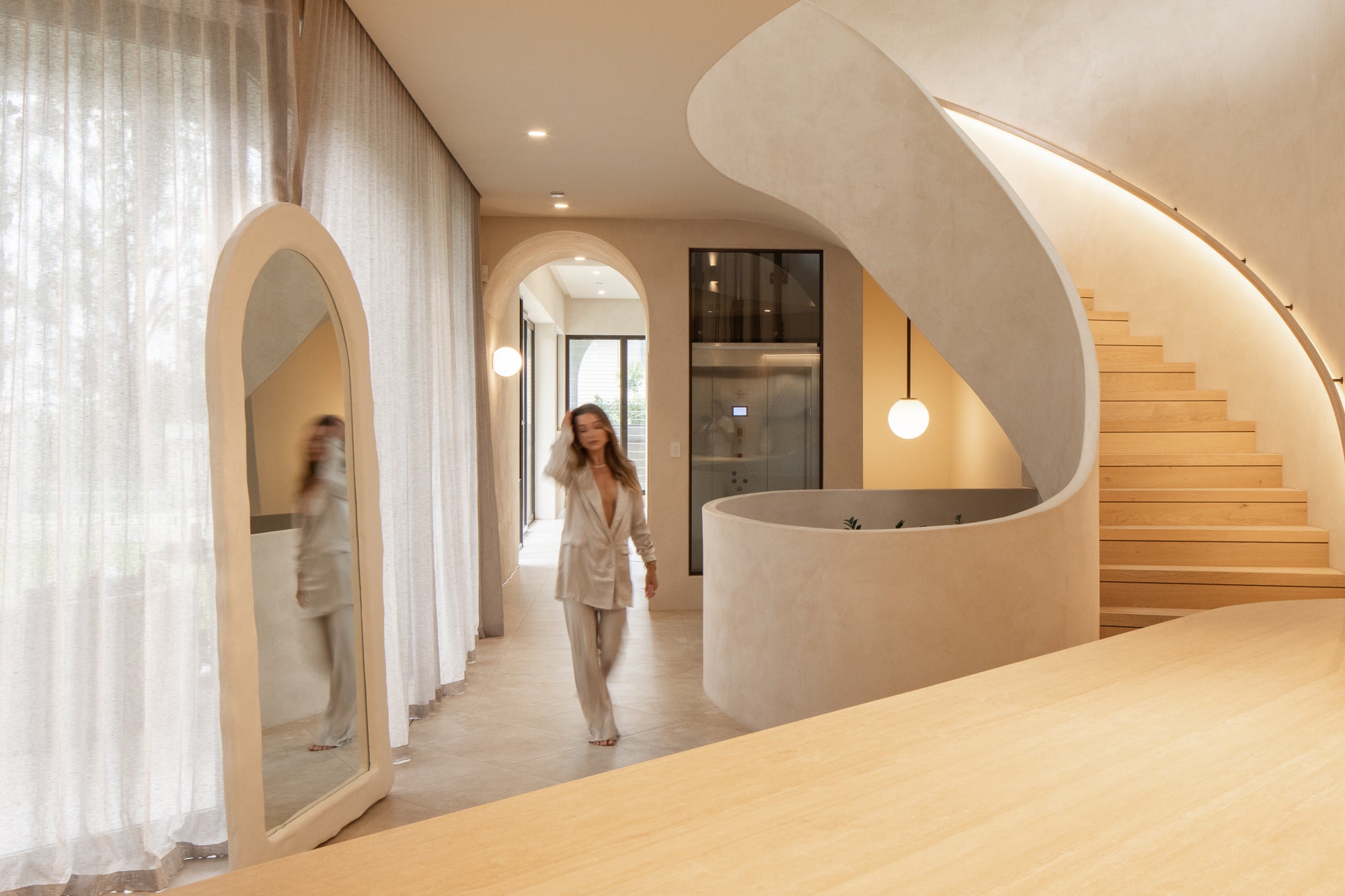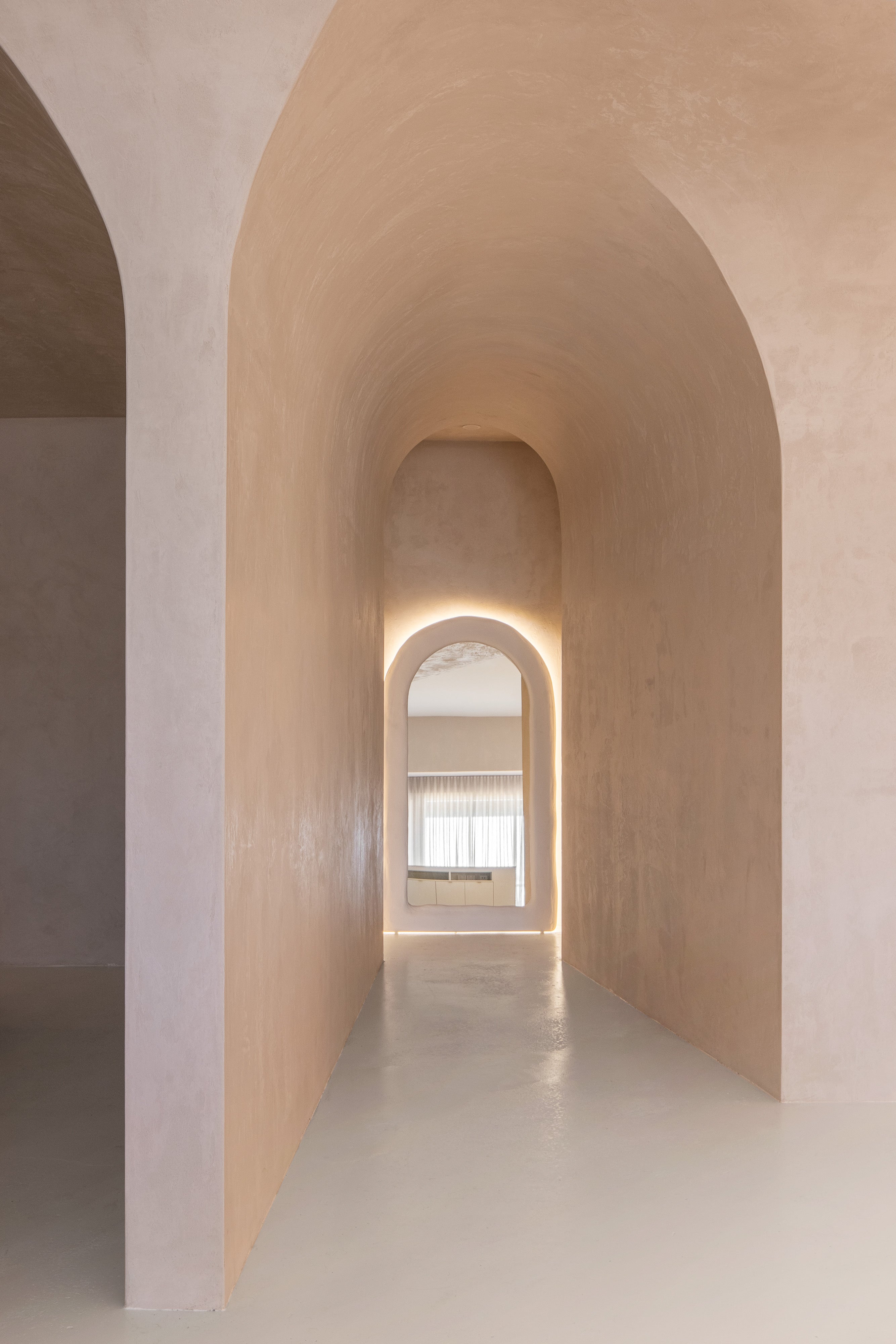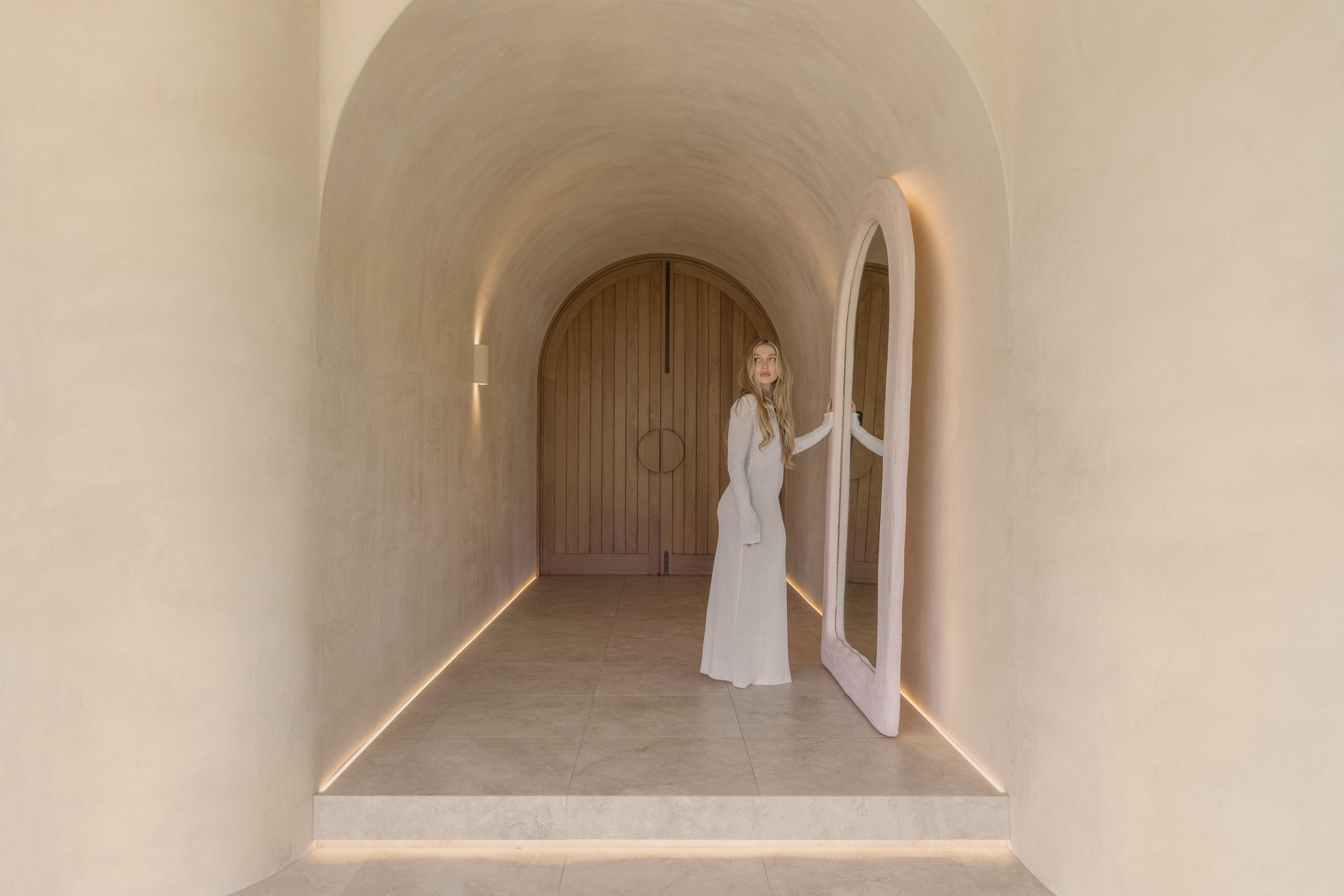 The original Santorini arch mirror, defined by rendered plaster curves and soft integrated lighting. A forever piece, designed to last a lifetime.